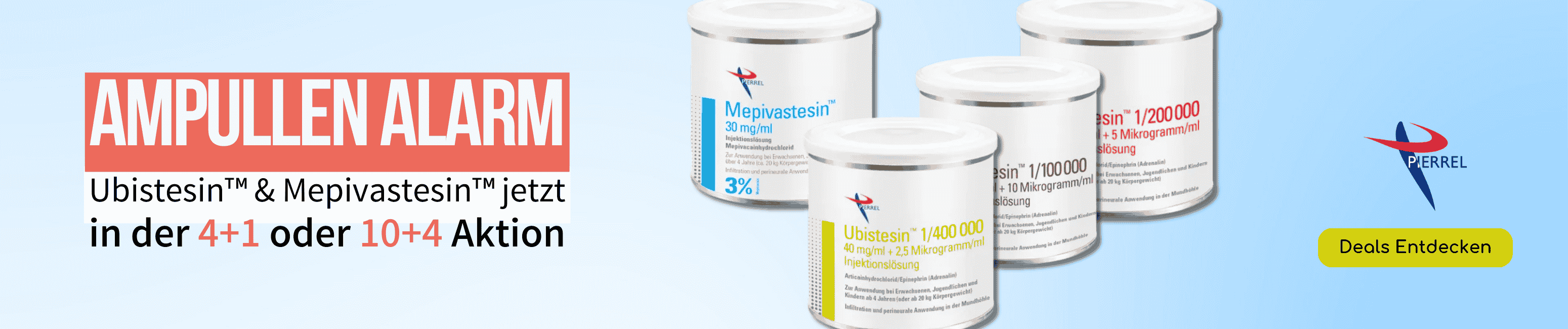 Ubistesin™ 1/200.000 bietet eine zuverlässige und effektive Lösung für die Lokalanästhesie in der Zahnheilkunde. Mit seiner schnellen Latenzzeit und langen Wirkungsdauer stellt es sicher, dass Deine Patienten während des Eingriffs optimal versorgt sind. Die sorgfältig ausgewählte Zusammensetzung gewährleistet eine sichere und effektive Anästhesie, ideal für den täglichen Gebrauch in Deiner Praxis.