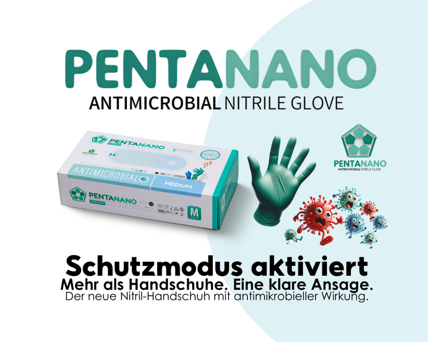 Pentanano Antimicrobial Nitril Handschuh Die Besonderheiten dieser Handschuhe sind: Tötet Bakterien & Viren bei jeder Berührung, schützen Sie sich selbst und Ihre Patienten Handschuhe bleiben im inneren 50% länger trocken als herkömmliche Handschuhe, was einen besseren Tragekomfort zur Folge hat Hohe Reissfestigkeit und Haltbarkeit, daher kein Ausschuss an Handschuhen Handschuhe sind in der Box gelegt, dadurch hat man eine wirkliche Einzelentnahme, und nicht mehrere gleichzeitig als Überschuss Antistatisch Geruchsfrei Inhalt Handschuhe Produktvideos: