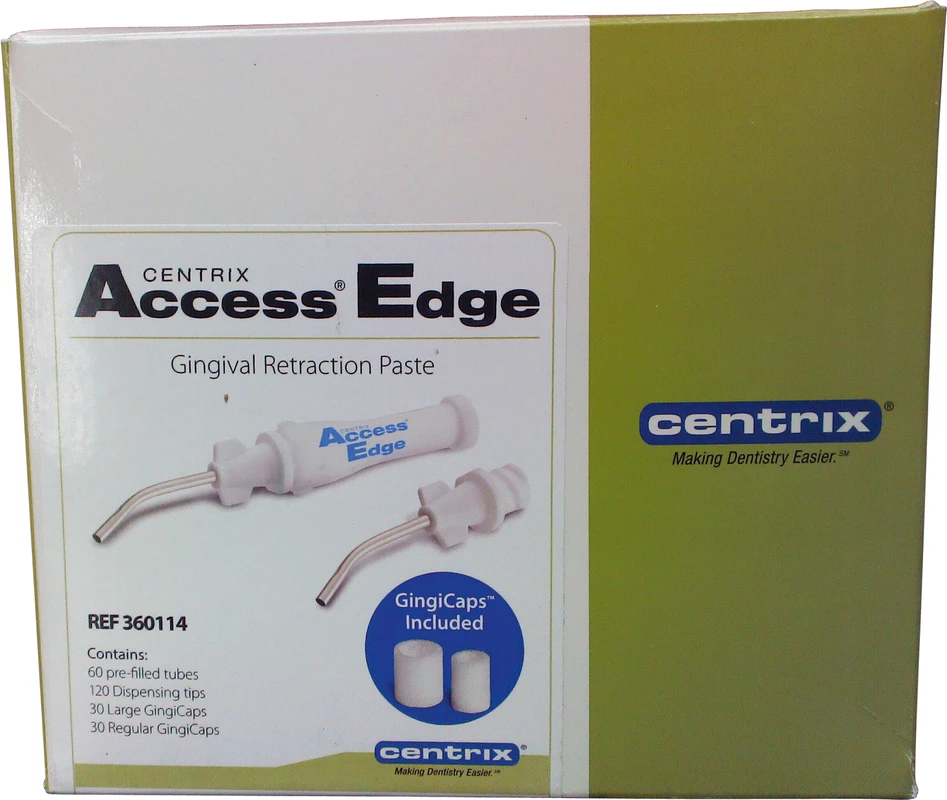 Zur Verwendung von Access Edge setzen Sie den Einheitsdosis-Aufsatz auf eine Centrix C-R-Spritze und injizieren das Material langsam in und um den gingivalen Sulkus. Zusätzlich kann GingiCap von Centrix verwendet werden, um die Paste in den gingivalen Sulkus zu pressen. Während Access Edge trocknet, retrahiert das Gewebe und gibt die gesamten Ränder des Restaurationsbereichs frei. Nach der Anwendung muss Access Edge gründlich ausgespült werden und der Sulkus an der Luft trocknen, so dass der Präparationsbereich „offen“ und sauber ist.
