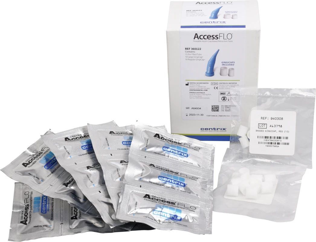 Einzigartige Gingiva-Retraktionspaste auf Tonerde-Basis in praktischem Einheitsdosis-Aufsatz. Doppelt Adstringierende/hämostatische Wirkung von Kaolin-Tonerde mit 15 % Aluminiumchlorid zur Kontrolle von Blutungen und dem Aussickern von Flüssigkeiten. Sanfte, nicht traumatische Gingivaretraktion ohne Fadenlegen. Access® FLO härtet in 2 Minuten aus. Einfaches Ausspülen, um einen sauberen „offenen“ Sulkus zu erhalten. Sanfte, aber effektive Behandlung des Weichgewebes garantiert klar abgegrenzte Ränder für besser passende Restaurationen. Kann als zweiter Faden im Rahmen der „2-Fadenmethode“ verwendet werden.