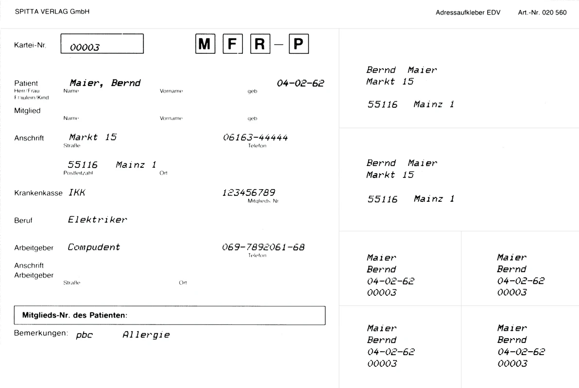 Karteikarten sollen außen übersichtlich beschriftet sein - und sind es selten! Denn bei längerem Gebrauch mit mehrmaligem Ändern der Patientendaten (wegen Umzug, Hochzeit, Arbeitgeberwechsel usw.) auf der Kartei leidet die Übersichtlichkeit zumeist enorm. Halten Sie deshalb stets die Adressaufkleber von Spitta bereit, die Ihnen Übersichtlichkeit und Ordnung garantieren: Neu beschriftet auf die Karteikarte kleben - und jede behält ihr schönes „Gesicht“.