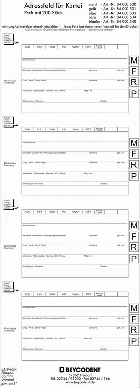 Die Adressfeldstreifen Typ 530 sind speziell für die effiziente Organisation von Patientenkarteien im DIN A5/DL-Format konzipiert. Mit vier untereinander angeordneten, einzeln abziehbaren Etiketten pro Streifen ermöglichen sie eine präzise und saubere Beschriftung. Dank des neuen Vorstoßes für EDV-Drucker bleibt der rückseitige Versatz nach dem Abziehen eines Etiketts erhalten, wodurch der Drucker stets mit dem gleichen Abstand arbeitet.