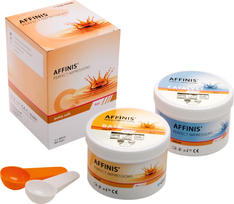 AFFINIS® Putty soft ist der Klassiker im Sortiment der AFFINIS®-Knetmassen. Angenehmes und einfach schnelles Anmischen zeichnen die aufeinander abgestimmten Konsistenzen von Basis und Katalysator aus.