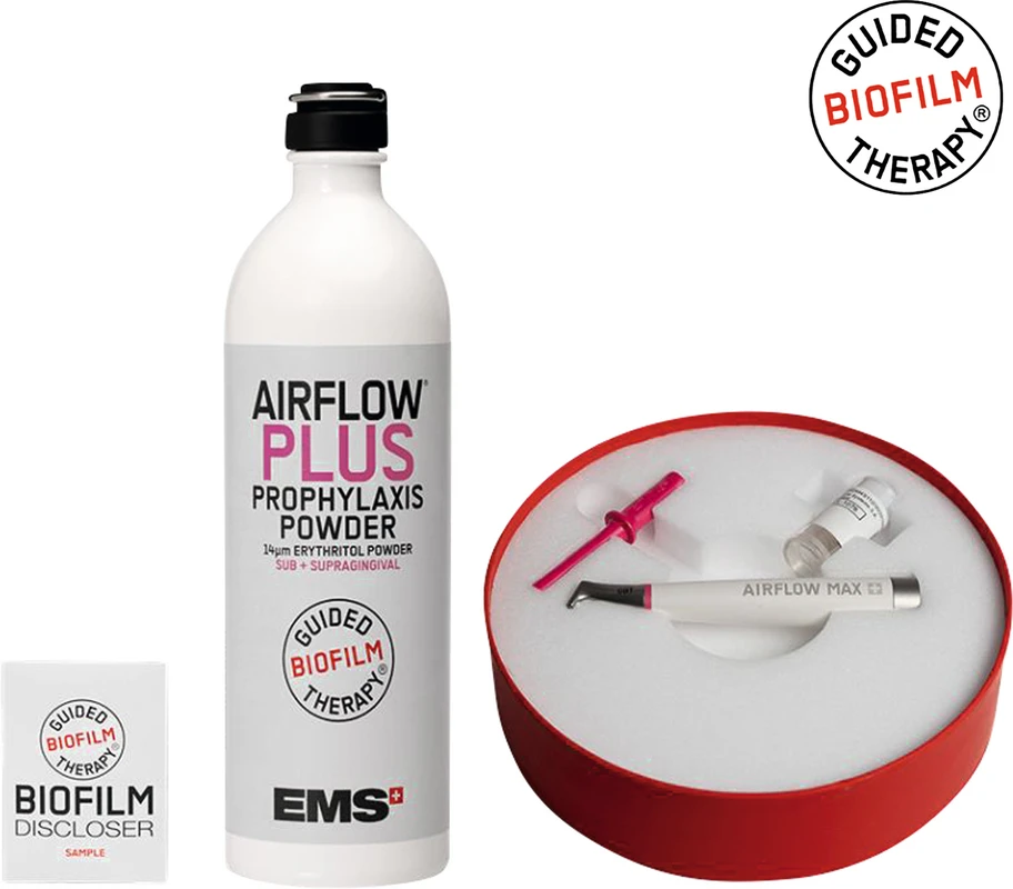 Zusammen mit dem universellen 14 µm AIRFLOW® PLUS Pulver entfernt AIRFLOW® MAX Biofilm, Verfärbungen und jungen Zahnstein supra- und subgingival bis zu 4 mm Taschentiefe auf natürlichen Zähnen, kieferorthopädischen Apparaturen, Restaurationen und Implantaten. Es reinigt und poliert in einem Schritt und in schwer zugänglichen Bereichen, die von Gummikelchen und Polierpasten nicht erreicht werden. Das AIRFLOW® MAX Einführungskit SMART ist das clevere AIRFLOW®-Allzweck-Kit mit dem neuen AIRFLOW® MAX Handstück, dem AIRFLOW® PLUS Pulver in der neuen Aluminiumflasche, einer Probepackung des Biofilm Discloser und einem 20 % Gutschein für Ihr nächstes GBT Praxistraining.