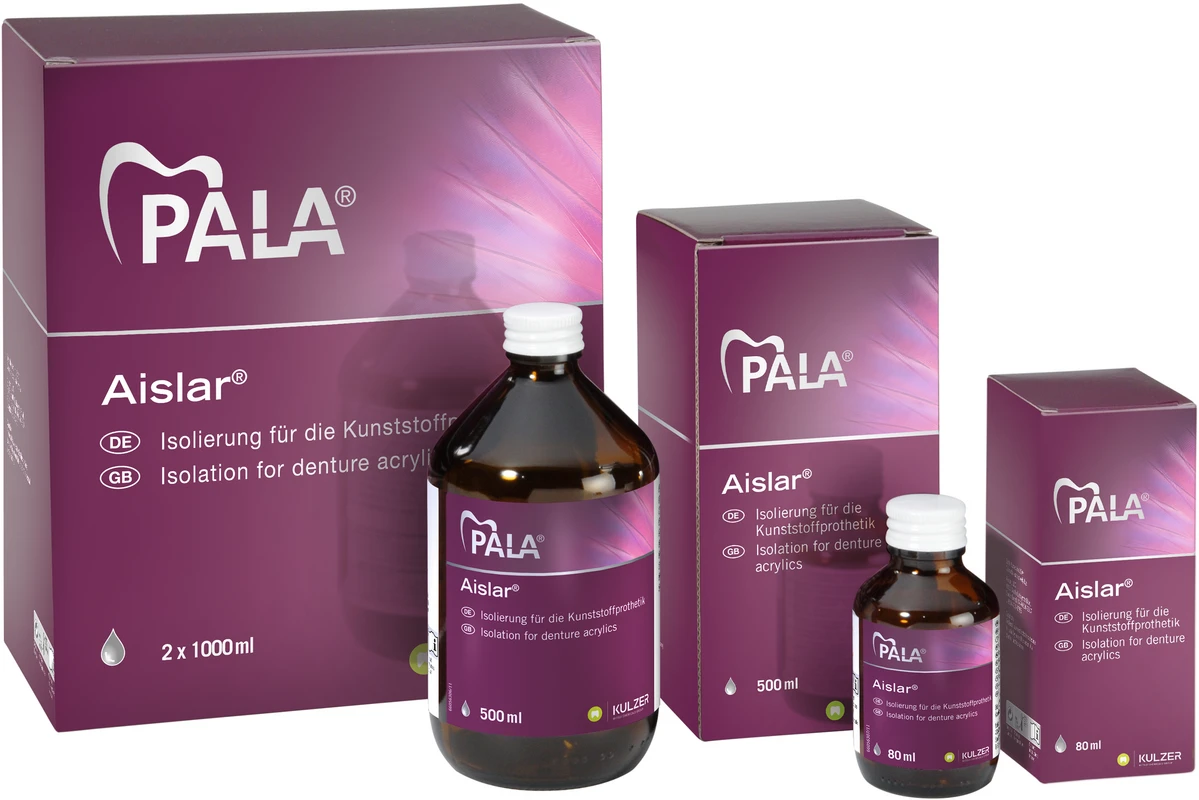 Sichere Isolierung für die Kunststoffprothetik. Eine gute Isolierung ist die Basis für eine passgenaue prothetische Versorgung. Aislar® ist eine formaldehydfreie, wässrige Lösung auf Alginatbasis zur Isolierung von Gipsoberflächen gegen Prothesenkunststoffe und Komposite. Dabei gibt es sehr vielfältige Anforderungen an eine Isolierung, wie eine schnelle Trocknungszeit, glatte Oberflächenwiedergabe und eine einwandfreie Trennung. Diese Eigenschaften werden von Aislar® sowohl bei heiß- als auch bei kaltpolymerisierenden Prothesenkunststoffen erfüllt.