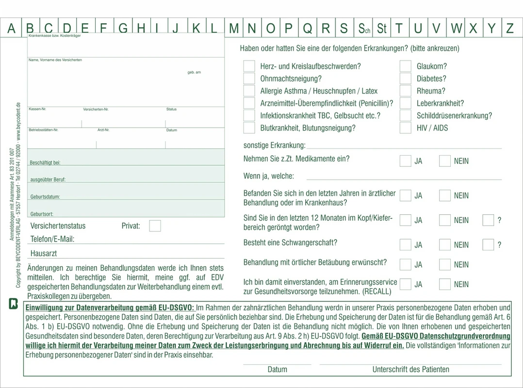 Anmeldebogen-Anamnesebogen A5 mit Einwilligung zur EU-DSGVO Datenschutzgrundverordnung