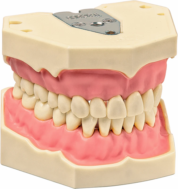 Das Arbeitsmodell entspricht einem Erwachsenengebiss. Die Modellbasis ist aus hartem, verzugsfreiem Kunststoff, bei der die Ober- und Unterkiefer in einer stabilen Interkuspidation mit 32 verschraubbaren Zähnen aus Duroplast okkludieren. Die Metallrückenplatte mit Gewinde ermöglicht das wahlweise Einschrauben oder Befestigen mit Magnetaufnahmeplatten in frasaco-Phantomköpfe.