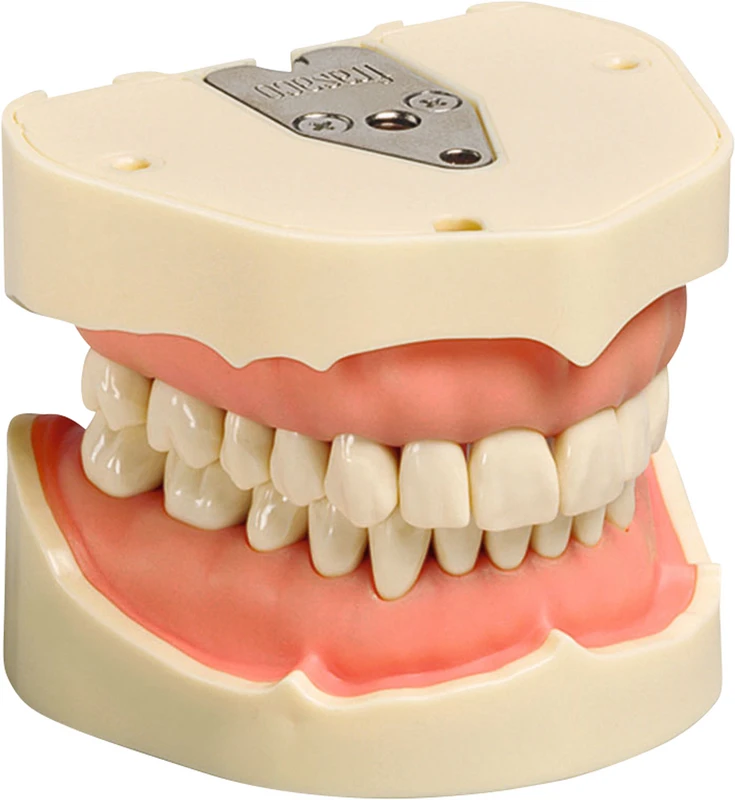 Arbeitsmodell entsprechend einem natürlichen typischen Erwachsenengebiss. Modellbasis aus hartem, verzugsfreiem Kunststoff. Ober- und Unterkiefer okkludieren in einer sicheren zentrischen Okklusion mit natürlichen physiologischen Kontaktpunkten. 28 Modellzähne aus Duroplast mit Kreuzkopfschrauben im Modell stabil fixiert und Metallrückenplatte mit Gewinde zum wahlweisen Einschrauben oder Befestigen mit Magentaufnahmeplatten in frasaco-Phantomköpfe.