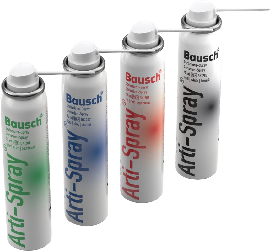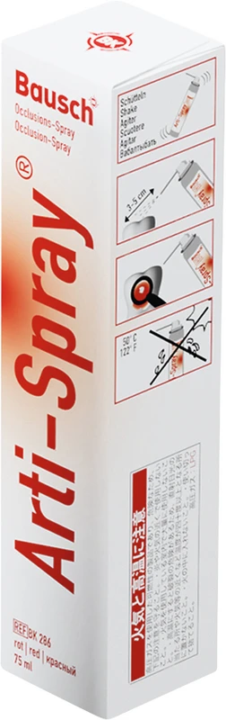 Arti-Spray® ist ein universeller Farbindikator zur Prüfung von Occlusalkontakten und Passgenauigkeit von Kronen und Brücken. Arti-Spray® ist leicht zu dosieren und bildet eine dünne Farbschicht, die sich einfach mit Wasser rückstandsfrei entfernen lässt. Arti-Spray® besteht aus physiologisch unbedenklichen Inhaltsstoffen, die den Anforderungen des Medizinproduktegesetzes entsprechen.