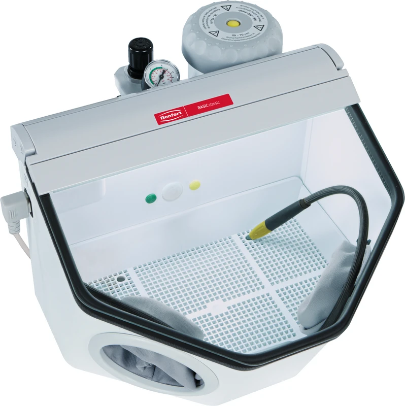 Große Technik auf kleinen Raum. Feinstrahlgerät mit bis zu 2 Tanks. Kompaktes Feinstrahlgerät mit Grundausstattung. Präzises Arbeiten bei bester Kosteneffizienz mit der speziellen Mischkammer. Innovatives PerfectView Concept: