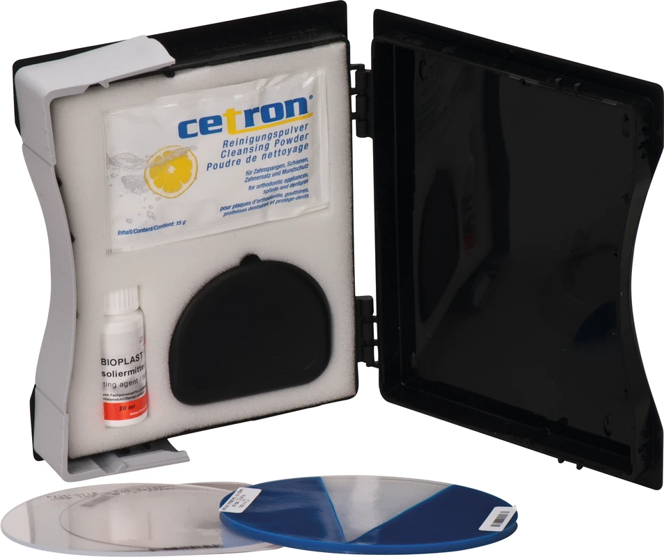 Inhalt: 1 BIOPLAST XTREME-Folie blau, 1 BIOPLAST-Folie klar, 1 DURAN-Folie, 1 Beutel CETRON-Reinigungspulver, 1 Retainerdose, 1 BIOPLAST-Isoliermittel