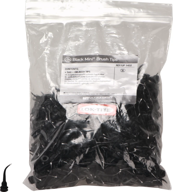 Kunststoffansatz, schwarz, gebogen, mit Bürstenspitze (Ø 1 mm), zur Applikation niedrig visköser Materialien. Ansatz gibt mehr "Widerstand“ als der Inspiral Brush Tip. Zu verwenden mit: Peak SE, Seek/Sable Seek, Ultradent Silane und Ultradent Universal Dentin Sealant. Inhalt Applikationskanülen