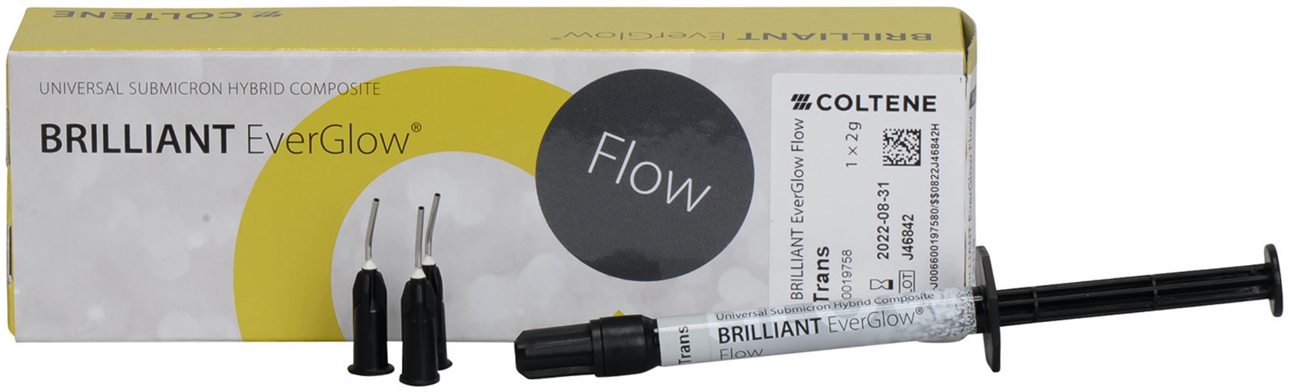 BRILLIANT EverGlow™ ist nun zusätzlich in einer fließfähigen Variante erhältlich. Das niederviskose Füllungsmaterial verbindet komfortables Applizieren mit gleichzeitig hoher Standfestigkeit. Ideal zum Auffüllen schwer erreichbarer Bereiche sowie zur Fissurenversiegelung. Die Flow-Variante kann material- und zeitsparend direkt aus der Spritze auf die gebondete Oberfläche aufgetragen werden. Bis zur Polymerisation lässt sich das unter Druck fließfähige Komposit in aller Ruhe an die gewünschte Position bringen.
