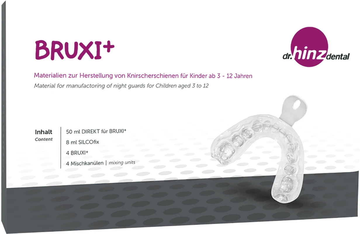 Materialien zur Herstellung von Knirscherschienen für Kinder ab 3 – 12 Jahren. BRUXI+ verhindert nächtliches Zähneknirschen, entspannt die Kaumuskulatur und schützt den Zahnschmelz. Nächtliches Zähneknirschen ist weit verbreitet: ca. 20 % aller Kinder und Jugendlichen sind davon betroffen. Das geräuschvolle Zähneknirschen kann bereits nach Durchbruch der Milchbackenzähne im 2. Lebensjahr auftreten. Frühzeitig – ab dem 3. Lebensjahr – angewandt, kann das Knirschen nachhaltig abgewöhnt werden. Die Schiene ist in einer Größe erhältlich und wird für das Milchgebiss gekürzt. Eine Individualisierung im Mund direkt oder auf dem Kiefermodell mit DIRECT für BRUXI+ und SILCOfix Haftvermittler ist notwendig.