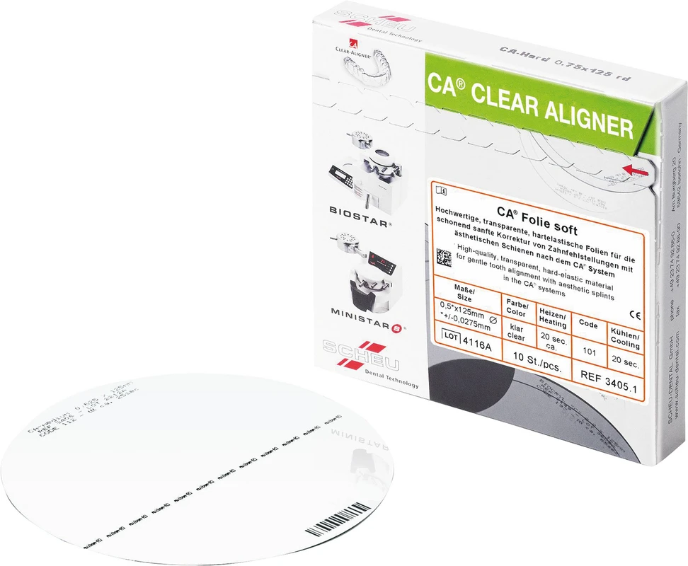 Hochwertige, transparente, hartelastische Folien für die schonend sanfte Korrektur von Zahnfehlstellungen mit ästhetischen Schienen nach dem CA® System. Alle Folien tragen die original CA® Kennzeichnung mit Stärkenangabe: extra soft (0,4 mm), soft (0,5 mm), medium (0,625 mm) und hard (0,75 mm).