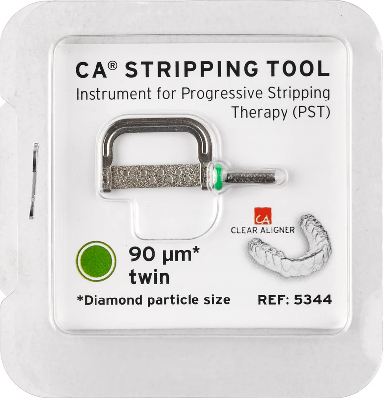 Sterilisierbare, ein- oder beidseitig diamantierte Instrumente zur Interdentalen Schmelz-Reduktion (ISR), in zwölf verschiedenen Ausführungen erhältlich. Beschichtung wahlweise links, rechts oder doppelseitig. Zur Politur steht zusätzlich ein glattes, extra frein beidseitig diamantiertes CA Stripping Tool (15 μm) zur Verfügung. Zur sicheren Anwendung der CA Stripping Tools ohne OS-Handstück eignet sich der sterilisierbare Halter aus Edelstahl mit Überwurfmutter für einen schnellen und einfachen Wechsel der Instrumente.