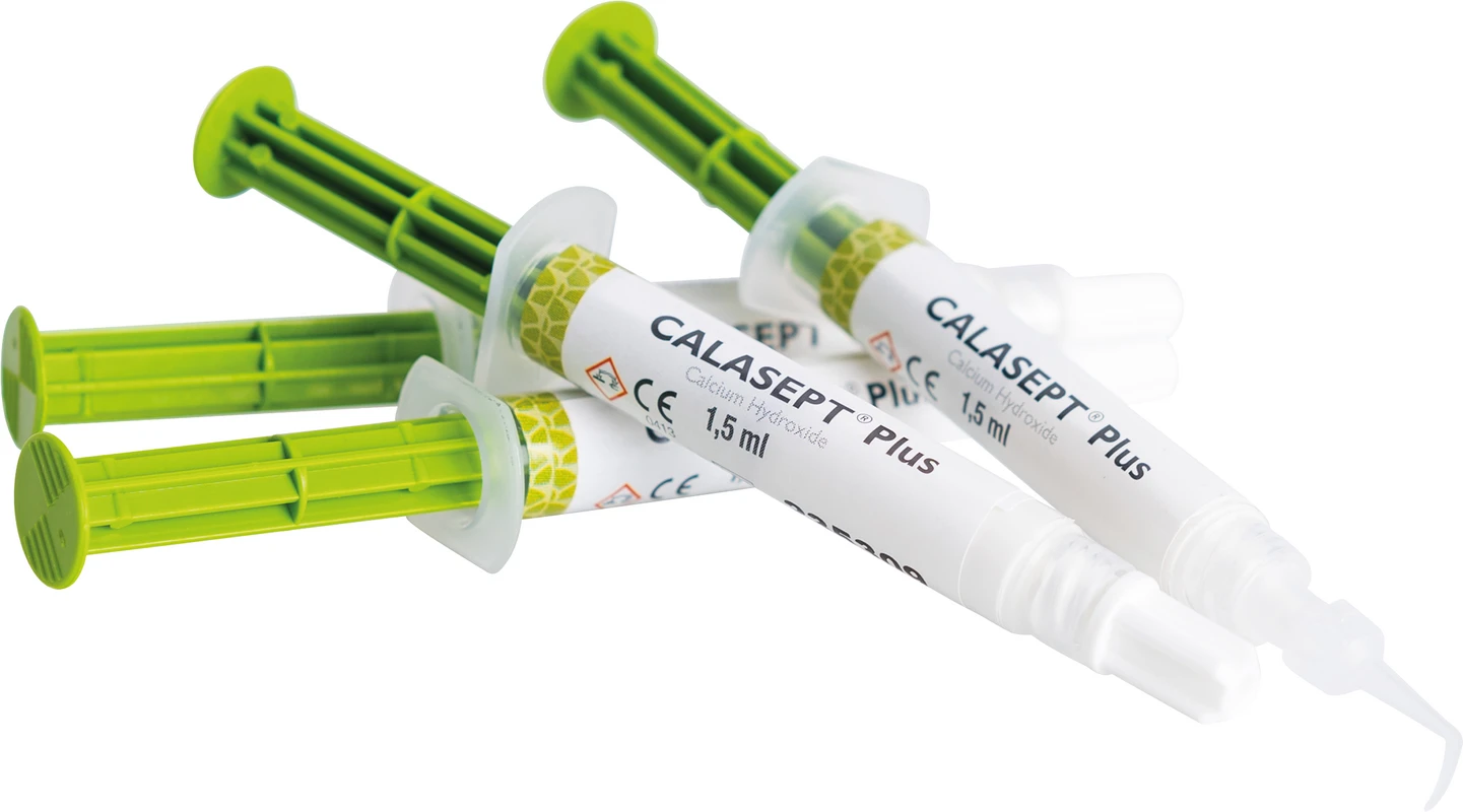 CALASEPT® Plus hat einen sehr hohen Anteil an Kalziumhydroxid (> 41 %) mit einer hohen Konzentration an Hydroxylionen. Dies führt zum hohen pH-Wert von 12,4 und einer deutlich antibakteriellen Wirkung, d. h. Bakterien werden abgetötet. CALASEPT® Plus ist röntgenopak. Die hohe Konzentration von Kalziumhydroxid steht für Langzeitwirkung, da die Paste langfristig Kalziumionen freisetzt. CALASEPT® Plus ist eine gebrauchstfertige Paste in luftdichten, vorgefüllten Spritzen, die direkt mit den Flexi-tips aufgetragen wird.