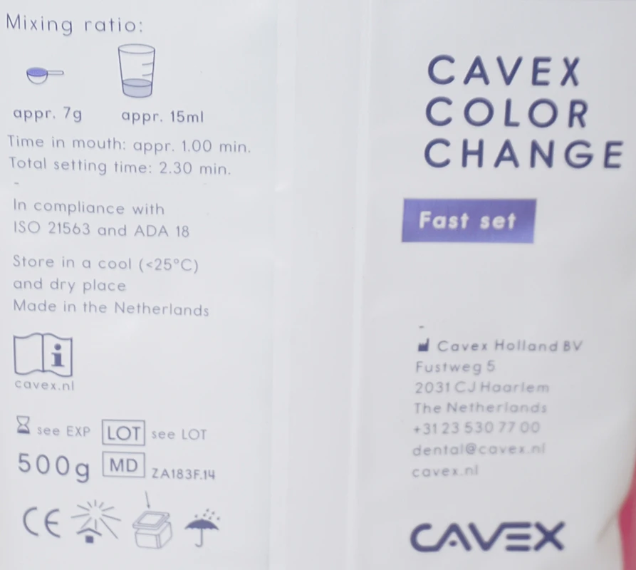 Cavex CA37 ist ein Allround-Alginat, das täglich von zehntausenden Zahnarztpraxen weltweit verwendet wird. Es ist das erste Alginatabdruckmaterial überhaupt, welches zum weltweiten Standard geworden ist.Dieses robuste Alginat ist in Normal Set (90 Sek.) und Fast Set (60 Sek.) erhältlich. Diese kurze Aushärtezeit macht die Behandlung für den Patienten angenehmer, ebenso wie das angenehme Pfefferminzaroma. Auch für prothetische Arbeiten ist das Cavex CA37 sehr gut geeignet. Feste Konsistenz Hohe Reiß- und Druckfestigkeit Detailwiedergabe mindestens 50 μm Abbindezeiten: Normal Set: 1,30 Minuten, Fast Set: 1 Minute Inhalt Alginat