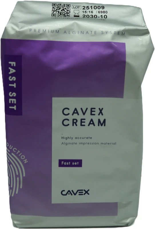 Die sensationelle neue Formel sprengt alle Dimensionen bisheriger Alginate. Der jüngste Spross der Cavex Alginat-Familie ist das Cavex Cream Alginat. Dieses moderne Alginat lässt sich sehr einfach zu einer großartigen, glatten und cremigen Masse mischen. Dank der unvergleichlichen Detailgenauigkeit von 5 μm in Kombination mit den „serienmäßigen“ Cavex Alginat-Eigenschaften, wie z.B. hohe Reißfestigkeit, Normalhärtung und 5 Jahre Haltbarkeit, beginnt sich Cavex Cream Alginat der Silikonqualität ernsthaft zu nähern. Natürlich ist dieses moderne Alginat auch scannbar. Leicht anmischbar zu einer glatten cremigen Masse Unvergleichliche Detailgenauigkeit von nur 5 μm !! Besonders hohe Reißfestigkeit Tage dimensionsstabil Staubfrei Scannbar Fast Variante: Schnell abbindend 1:00 min Inhalt Alginat