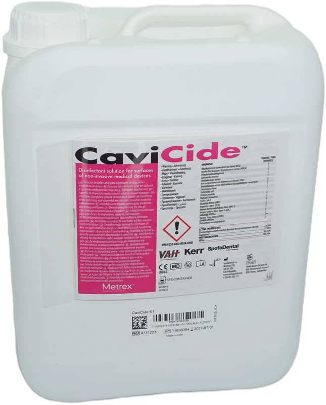 CaviCide ist ein praktisches, gebrauchsfertiges Zwischenstufen-Desinfektionsmittel für die Verwendung auf harten, nicht porösen Oberflächen von medizinischen und zahnmedizinischen Geräten. Es ist wirksam gegen Tuberkulose (TB), Viren, Bakterien und Pilze. CaviCide enthält nur 17 % Alkohol und ist daher weniger aggressiv als herkömmliche Produkte mit einem hohen Alkoholgehalt. Es wird empfohlen, vor der Verwendung von CaviCide die Gebrauchsanweisung zu lesen und sich über die lokalen Desinfektionsrichtlinien zu informieren.