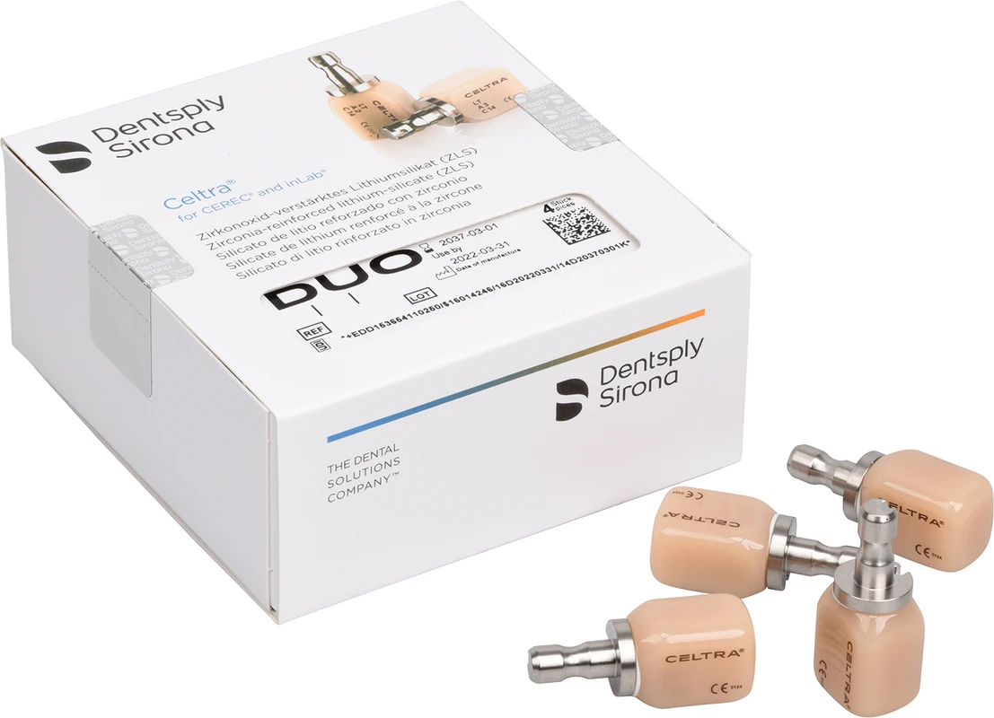 Celtra® Duo ist ein CAD/CAM-Block für die Chairside-Anwendung in CEREC-Geräten von Dentsply Sirona. Er enthält eine hochfeste Glaskeramik aus zirkonverstärktem Lithiumsilikat (ZLS), das sich durch hohe Biegefestigkeit, eine schöne Ästhetik, aufgrund seiner Opaleszenz und Transluzenz, sowie durch leichte Bearbeitbarkeit auszeichnet. Dank dieses neuen Werkstoff es lässt sich Celtra® Duo je nach klinischer Anforderung verarbeiten: Entweder ohne Brennen mit der nahezu doppelten Festigkeit konventioneller Glaskeramik oder mit einem kurzen Glasurbrand, der die Festigkeit auf das Niveau von Lithium Disilikat erhöht. Ein Block, zwei Möglichkeiten - Celtra® Duo vereint die Vorteile bisheriger CEREC-Blöcke in nur einem Produkt.