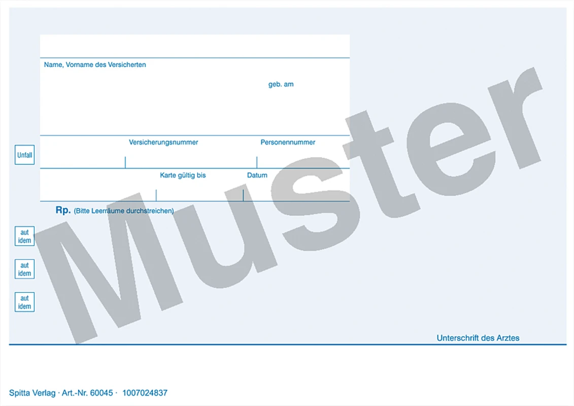 Dieses Chipkarten-Privatrezept erschwert Betrügern das Fälschen von Rezepten: Die komplett in blau gedruckte Schrift erschwert das Kopieren und somit die missbräuchliche Verwendung dieses Chipkarten-Privatrezepts.