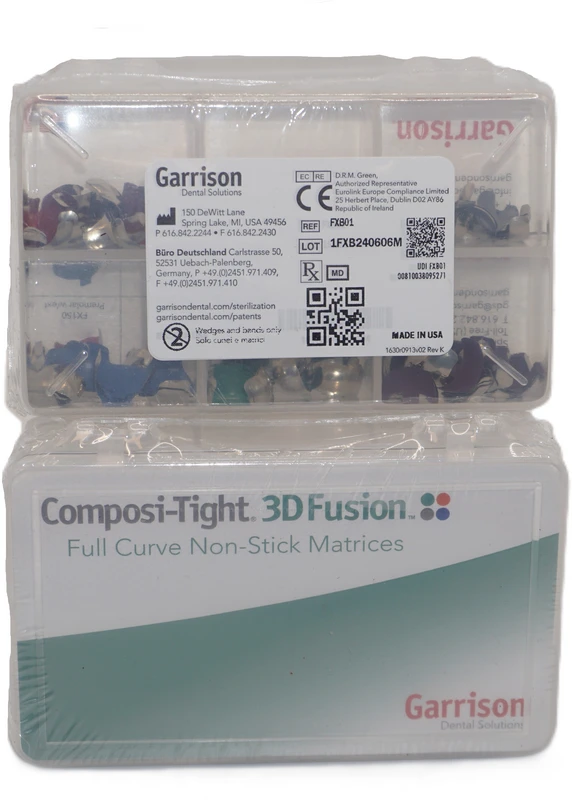 3DXR™ Ergänzung zum bewährten Composi-Tight 3D Teilmatrizensystem. Der neue Ring bietet höchste Retention bei sicherer Handhabung und wurde speziell für den Gebrauch an kurzen oder schiefen Zähnen und auch zwischen Eckzahn und erstem Prämolaren entwickelt. Die Ringspitzen greifen unterhalb des Kontaktbereichs und verhindern so ein Abspringen des Rings. 3D600, 3D500 Weiche Silikonenden passen sich optimal an die Zähne an und verhindern bukkale und linguale Kompositüberstände. Harter, lichtdurchlässiger Kern separiert die Zähne interproximal. Extra Aussparung für den Keil. 3D400Bestens geeignet für den Eckzahn distal. Sitzt perfekt an kurzen und schiefstehenden Zähnen. FX600Der neue 3D Fusion™ Ring für weite Kavitäten. Besonders gut für ausgedehnte, große Kavitäten. Hält selbst bei fehlenden Höckern. Die breiten Silikonfüßchen verhindern das Eindrücken der Matrize in die Kavität. FX500Der altbewährte Soft Face 3D™ Ring jetzt mit retentiven Spitzen. Extra Retentionsspitzen verhindern ein Abrutschen der Ringe. Verbesserte Ringform erleichtert das Öffnen und Platzieren der Ringe. Hält auch an großen Molaren. FX400Der beliebte 3DXR™ Ring ist jetzt noch leichter zu öffnen. Verbesserte Hufeisenform erleichtert das Öffnen und Platzieren der Ringe. Besonders geeignet bei kurzen und schiefstehenden Zähnen. Hält auch über einer Kofferdammklammer oder am Eckzahn distal. Inhalt 2 x 3D Fusion Ringe