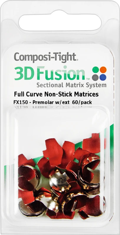 3DXR™ Ergänzung zum bewährten Composi-Tight 3D Teilmatrizensystem. Der neue Ring bietet höchste Retention bei sicherer Handhabung und wurde speziell für den Gebrauch an kurzen oder schiefen Zähnen und auch zwischen Eckzahn und erstem Prämolaren entwickelt. Die Ringspitzen greifen unterhalb des Kontaktbereichs und verhindern so ein Abspringen des Rings. 3D600, 3D500 Weiche Silikonenden passen sich optimal an die Zähne an und verhindern bukkale und linguale Kompositüberstände. Harter, lichtdurchlässiger Kern separiert die Zähne interproximal. Extra Aussparung für den Keil. 3D400Bestens geeignet für den Eckzahn distal. Sitzt perfekt an kurzen und schiefstehenden Zähnen. FX600Der neue 3D Fusion™ Ring für weite Kavitäten. Besonders gut für ausgedehnte, große Kavitäten. Hält selbst bei fehlenden Höckern. Die breiten Silikonfüßchen verhindern das Eindrücken der Matrize in die Kavität. FX500Der altbewährte Soft Face 3D™ Ring jetzt mit retentiven Spitzen. Extra Retentionsspitzen verhindern ein Abrutschen der Ringe. Verbesserte Ringform erleichtert das Öffnen und Platzieren der Ringe. Hält auch an großen Molaren. FX400Der beliebte 3DXR™ Ring ist jetzt noch leichter zu öffnen. Verbesserte Hufeisenform erleichtert das Öffnen und Platzieren der Ringe. Besonders geeignet bei kurzen und schiefstehenden Zähnen. Hält auch über einer Kofferdammklammer oder am Eckzahn distal. Inhalt 2 x 3D Fusion Ringe