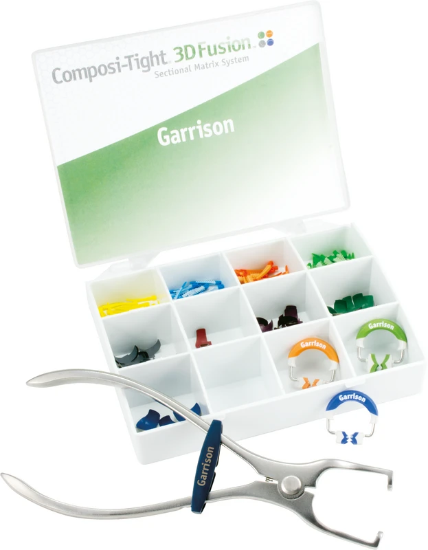 3DXR™ Ergänzung zum bewährten Composi-Tight 3D Teilmatrizensystem. Der neue Ring bietet höchste Retention bei sicherer Handhabung und wurde speziell für den Gebrauch an kurzen oder schiefen Zähnen und auch zwischen Eckzahn und erstem Prämolaren entwickelt. Die Ringspitzen greifen unterhalb des Kontaktbereichs und verhindern so ein Abspringen des Rings. 3D600, 3D500 Weiche Silikonenden passen sich optimal an die Zähne an und verhindern bukkale und linguale Kompositüberstände. Harter, lichtdurchlässiger Kern separiert die Zähne interproximal. Extra Aussparung für den Keil. 3D400Bestens geeignet für den Eckzahn distal. Sitzt perfekt an kurzen und schiefstehenden Zähnen. FX600Der neue 3D Fusion™ Ring für weite Kavitäten. Besonders gut für ausgedehnte, große Kavitäten. Hält selbst bei fehlenden Höckern. Die breiten Silikonfüßchen verhindern das Eindrücken der Matrize in die Kavität. FX500Der altbewährte Soft Face 3D™ Ring jetzt mit retentiven Spitzen. Extra Retentionsspitzen verhindern ein Abrutschen der Ringe. Verbesserte Ringform erleichtert das Öffnen und Platzieren der Ringe. Hält auch an großen Molaren. FX400Der beliebte 3DXR™ Ring ist jetzt noch leichter zu öffnen. Verbesserte Hufeisenform erleichtert das Öffnen und Platzieren der Ringe. Besonders geeignet bei kurzen und schiefstehenden Zähnen. Hält auch über einer Kofferdammklammer oder am Eckzahn distal. Inhalt 2 x 3D Fusion Ringe