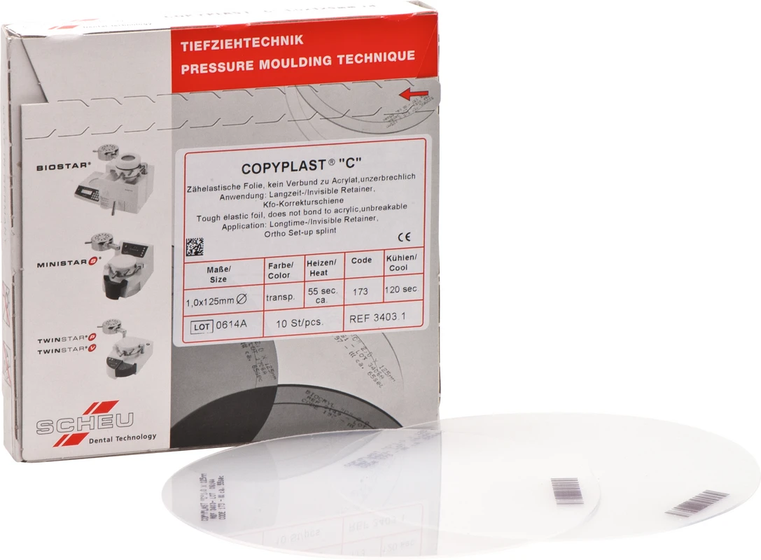Hochtransparente, zähelastische, unzerbrechliche abrasionsfeste Folien, verbinden sich nicht mit Autopolymerisat. Langzeit- und invisible Retainer, KFO-Korrekturschienen.