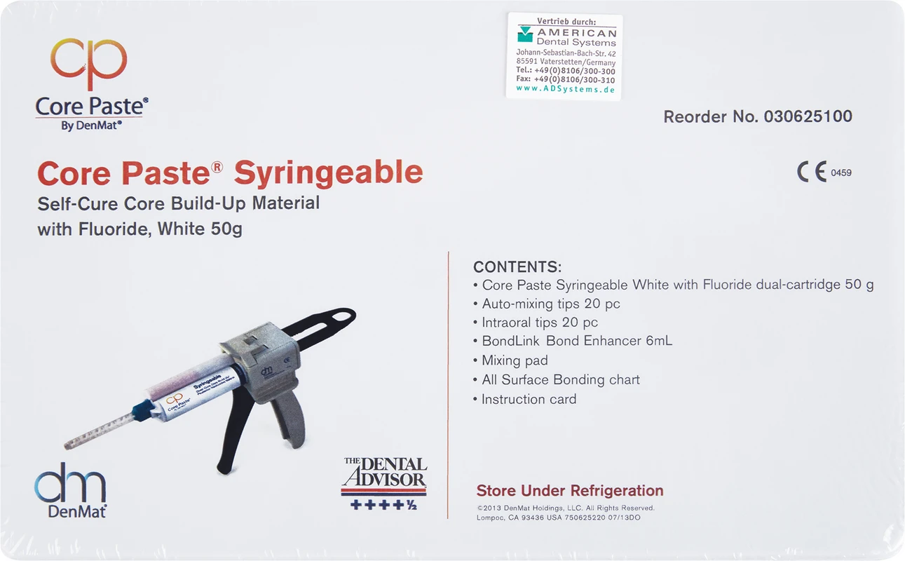 Core Paste ist seit Jahrzehnten das meistverwendete Präparat zum Aufbau von Kern- und Zahnstumpf. So wird, wenn Zahnsubstanz Mangelware ist, der Aufbaukunststoff Core Paste seit über 29 Jahren in der Kronen- und Brückenprothetik favorisiert. Core Paste ist auch mit Fluoridzusatz erhältlich. Farben: weiß, blau und zahnfarbe.