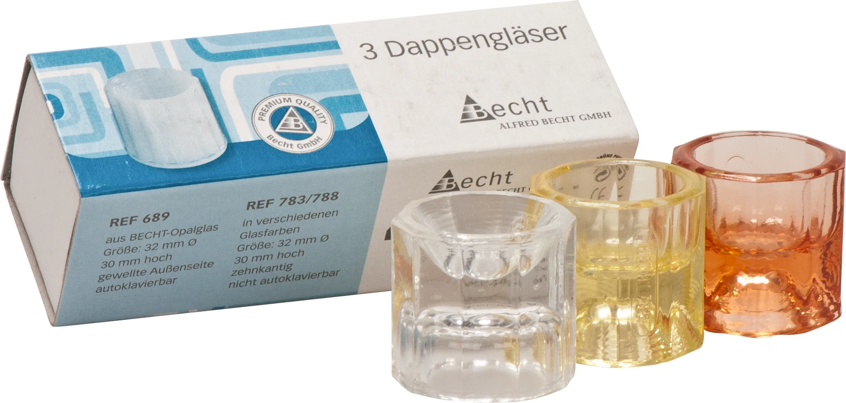 Aus farbigem Glas, zehnkantig, griffsicher, auf beiden Seiten unterschiedlich ausgeformt. Geeignet zum Anrühren von Zementen und Kunststoffen. Ø 32 mm , 30 mm hoch, ca. 2-3 ml Fassungsvermögen. Nicht autoklavierbar.