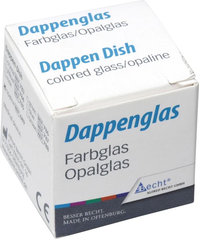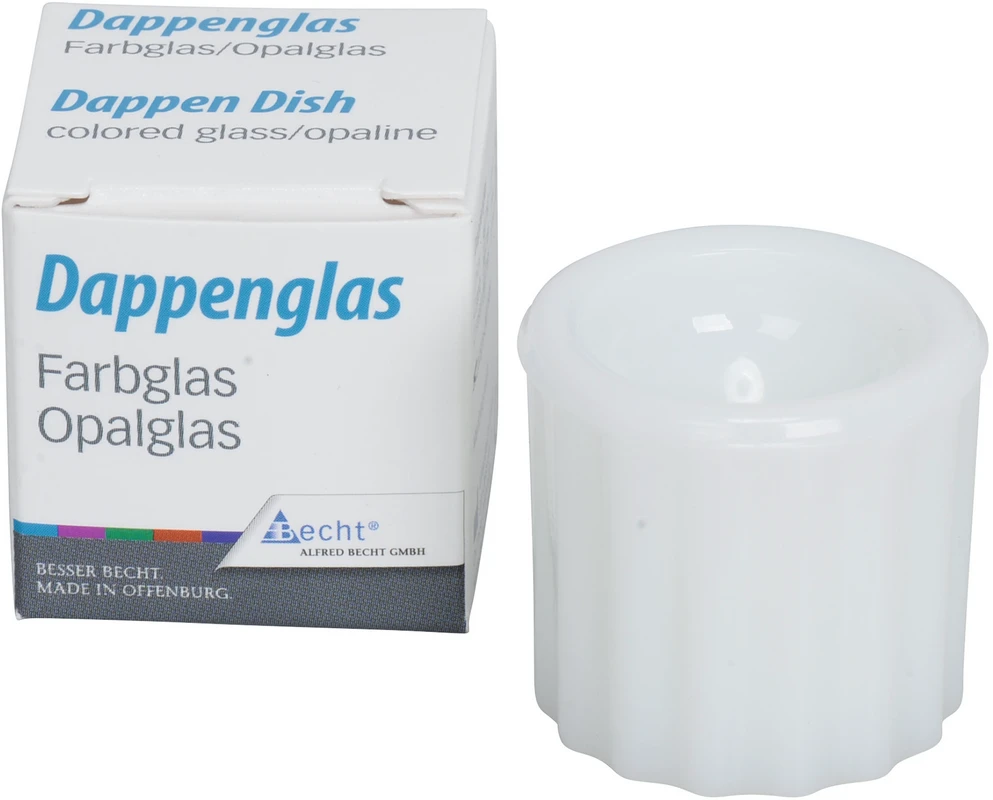 Dappenglas aus Opalglas, autoklavierbar, mit griffsicher gewellter Außenseite. Beidseitig verwendbar für verschiedene Einsatzmöglichkeiten. Geeignet zum Anrühren von Zementen und Kunststoffen sowie zur rationellen und problemlosen Füllung der Amalgampistole, ca. 2-3 ml Fassungsvermögen.