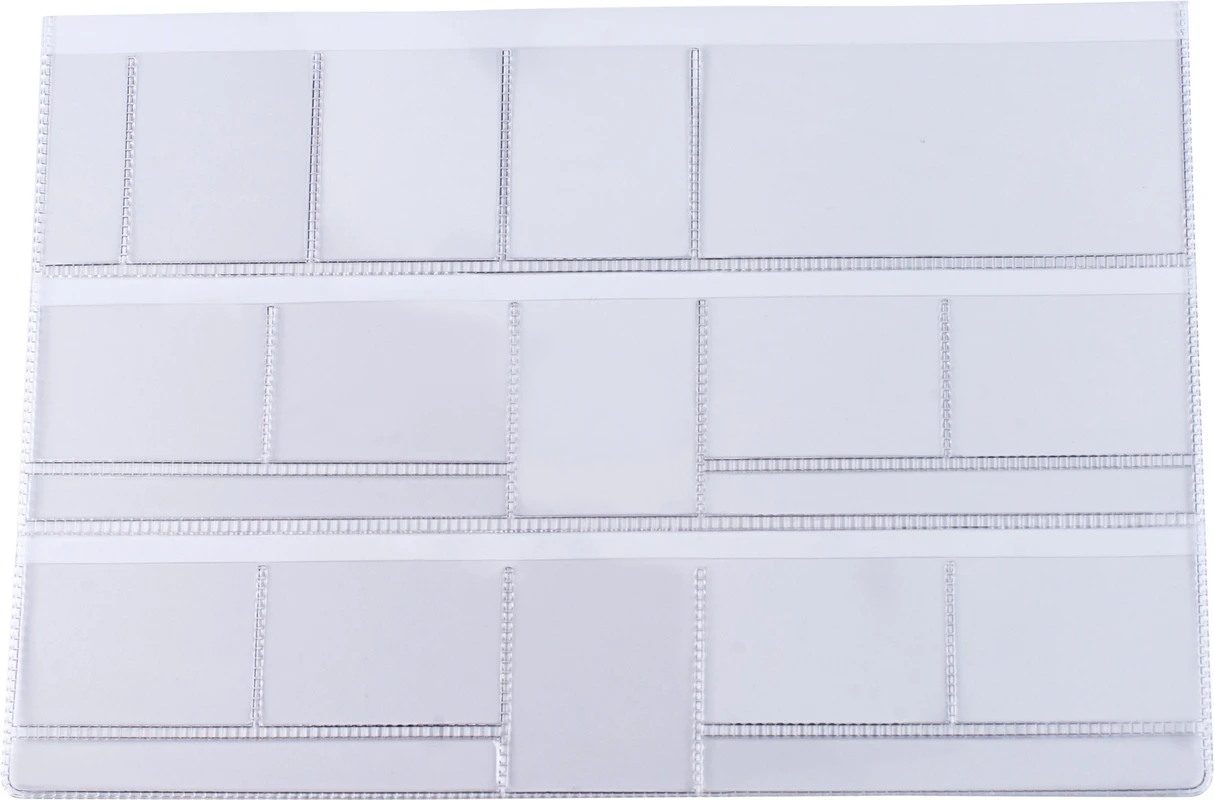 Durch Passgenauigkeit der einzelnen Felder ist ein Verschieben oder Herausfallen des Filmes auch bei starker Beanspruchung ausgeschlossen. Alle Taschen sind DIN A5 quer und aus filmneutraler Hart-Klarsichtfolie. Taschen zum Abheften haben eine Standardlochung für alle Ablagesysteme. Ausführungen mit Datenfeld werden mit einer dazu passenden Datenkarte geliefert.