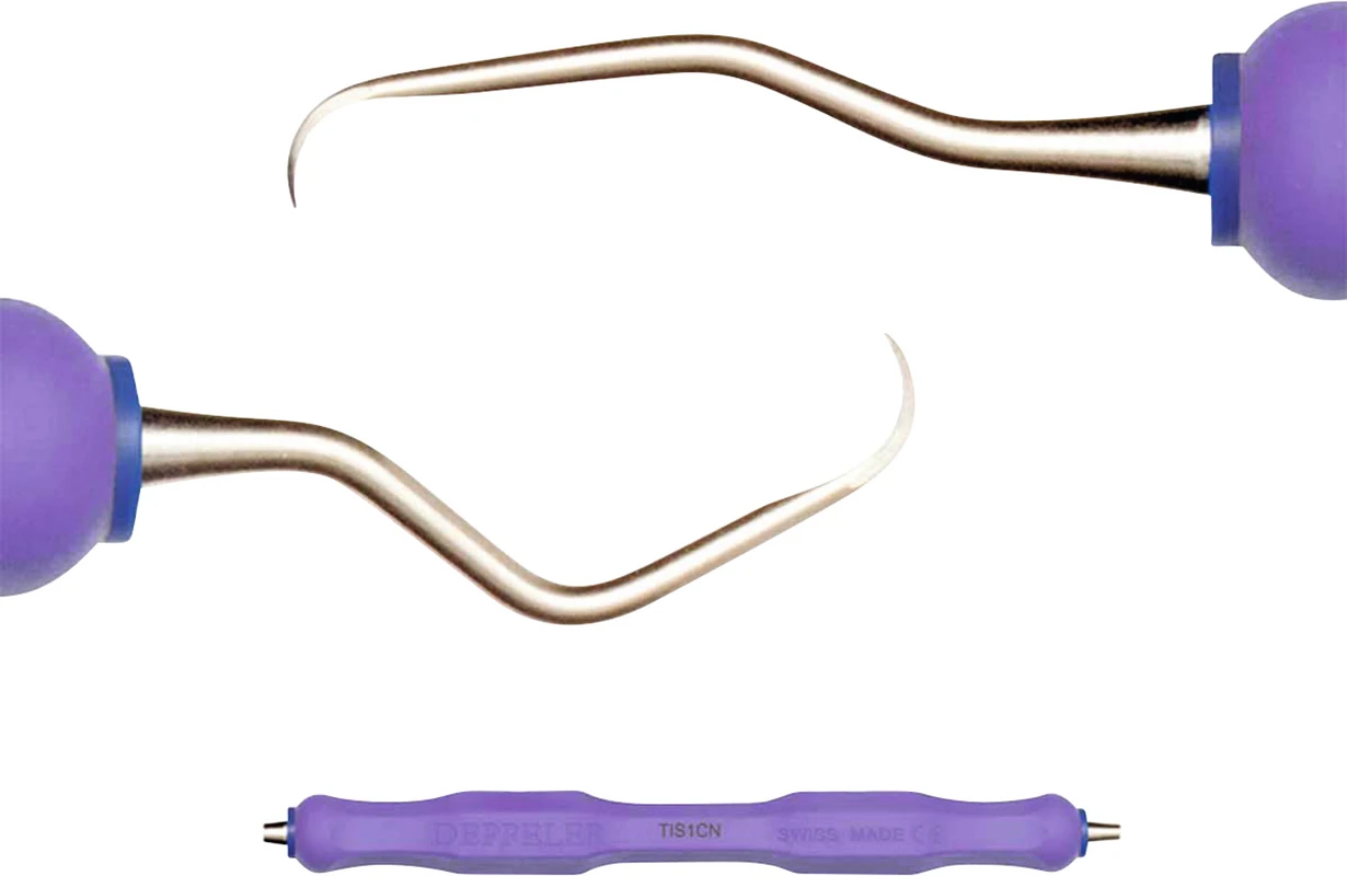 DEPPELER Titan-ImplantatkürettenWirksam ohne zu beschädigen: Die Implantatküretten bestehen aus purem Titan und sind etwas weniger hart als das Implantat, zur schadlosen Anwendung. Universalkürette aus Titan zur Zahnsteinentfernung an Titanimplantaten.