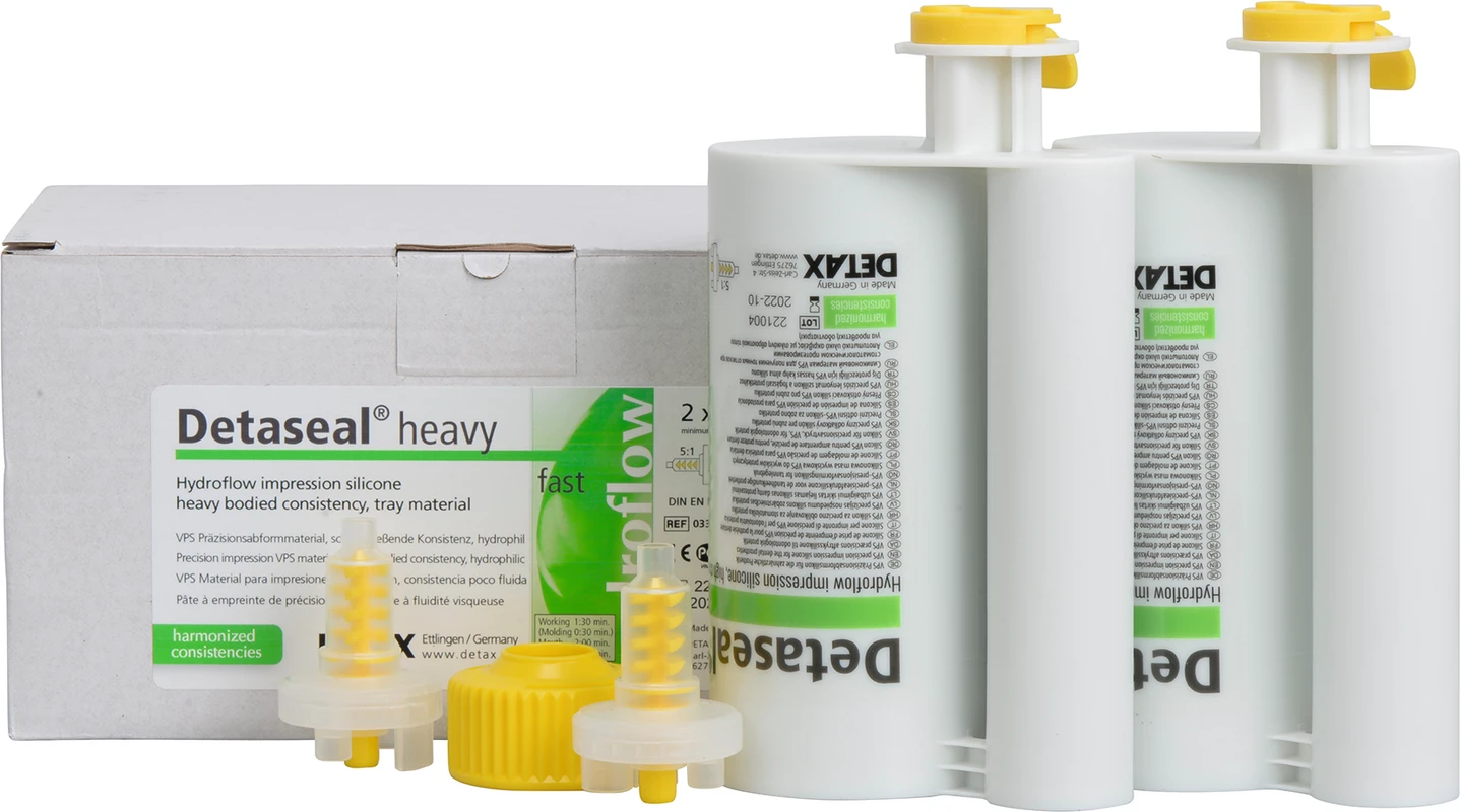 Hydroflow Abformsilikon, hohe Konsistenz, hydrophil, standfest, leicht entformbar durch mittlere Endhärte und hohes elastisches Rückstellvermögen. Harmonisierte Konsistenzen, form- und volumenstabil, 5:1 Hartkartusche für dynamische Mischgeräte. Farbe Base apfelgrün, Katalysator weiß. Schnellabbindend, Mundverweildauer 2 Minuten. Ideal als Löffelmaterial für Doppelmisch-/Sandwichtechnik in Kombination mit Detaseal® hydroflow lite/Xlite.
