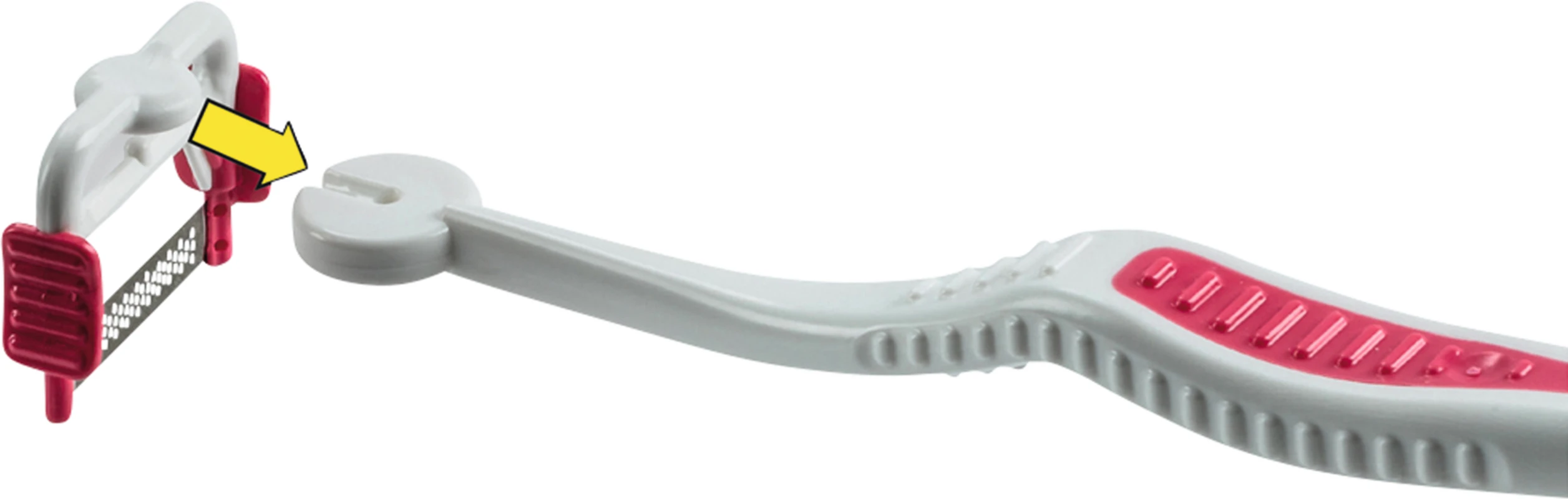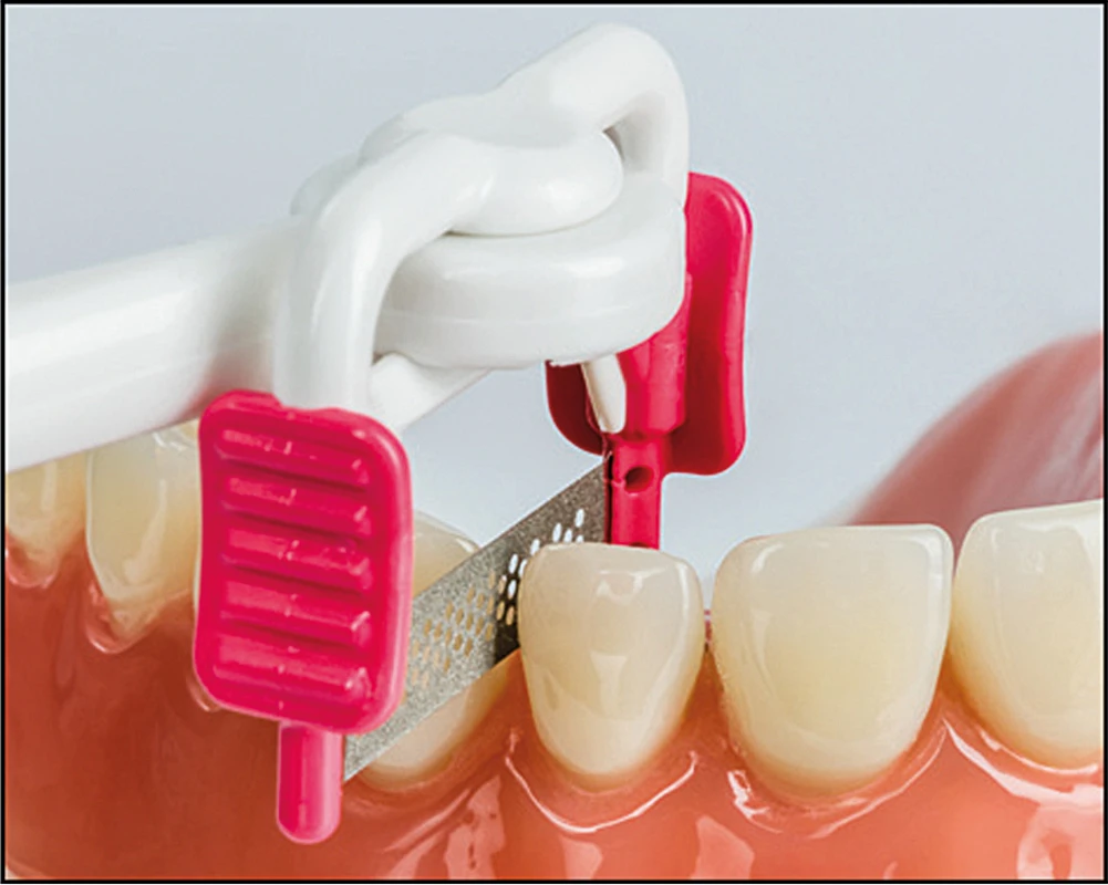 StripFIX Finierstreifensystem (Griffvorrichtung für Diamantstreifenhalter mit Klick-Stecksystem). Es bestehen verschiedene Diamantstreifenhalter welche nur zwischen die Finger geklemmt werden und das Arbeiten im Mund sehr schwierig gestalten, bedingt durch die Platzverhältnisse. Mit dem neu entwickelten StripFIX Finierstreifensystem kann das Arbeiten mit Diamantstreifen einfacher und kontrollierter gestaltet werden. Ein benutzerfreundlicher, ergonomischer Griff mit spezieller Griffmulde gewährleistet mehr Kontrolle für einen sicheren Gebrauches des StripFix Finiersystem. Das Klick- Stecksystem erlaubt einen einfachen und schnellen Austausch der Diamantstreifenhalter. Der schwenkbare Diamantstreifenhalter kann in je 4 Positionen einrasten. Damit wird die optimale Arbeitsposition (Winkel) des Diamantstreifens fixiert, um einen einfachen Zugang zu den vorderen und hinteren Zähnen in der Mundhöhle zu ermöglichen. Alle Komponenten des StripFIX Finierstreifensystems sind autoklavierbar und wieder verwendbar.