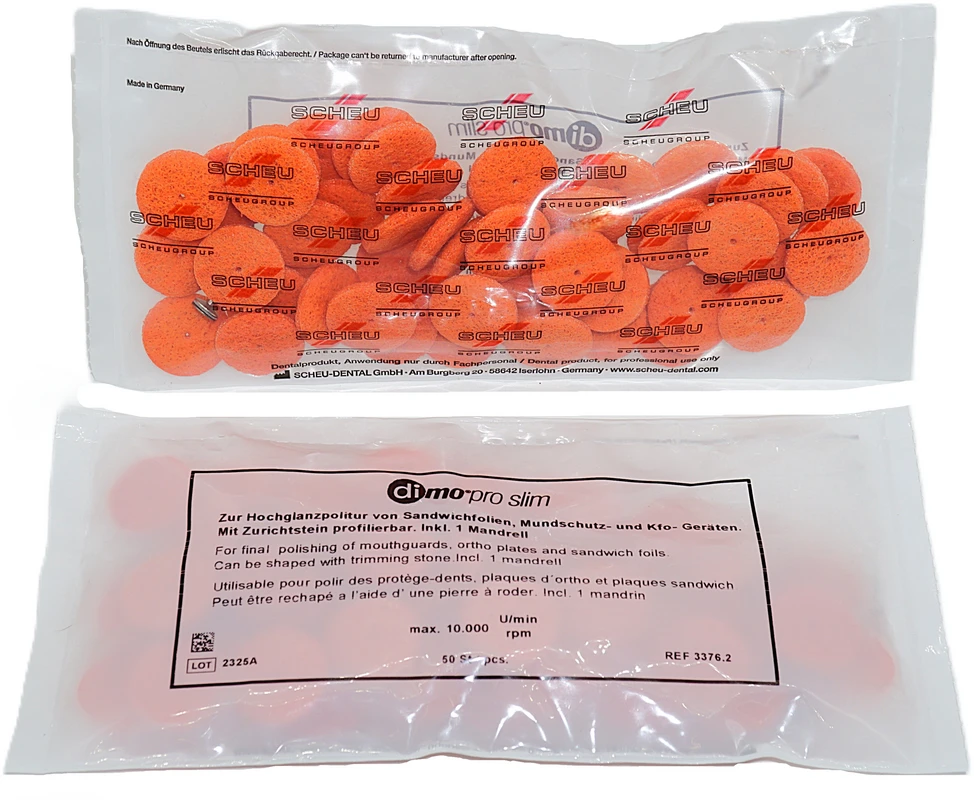 - DIMO® PRO: Zur Ausarbeitung der großflächigen Randbereiche und zur End- und Hochglanzpolitur von Schienen, Positioner, Mundschutz- und KFO-Geräten. Sorgt für hochglänzende Ränder und Übergänge bei der Verwendung von hart/weichen Verbundfolien