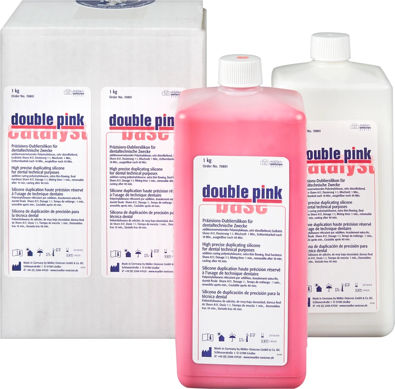double pink ist ein additionsvernetzendes Silikon auf Polyvinylsiloxanbasis für die Dublierküvetten-Technik. Sehr dünnfließend, schrumpffrei, absolute Zeichnungsgenauigkeit, reißfest, Härte Shore A17, Dosierung (1:1), bestens geeignet für Mischautomaten. Aushärtezeit: 15 Min.