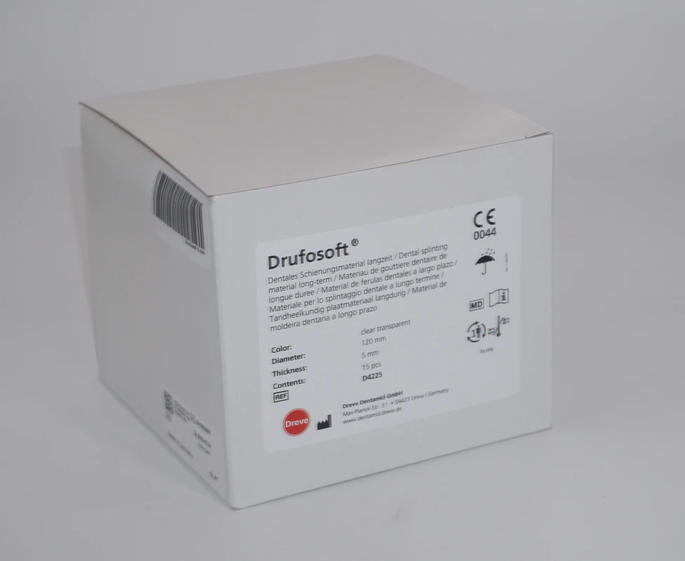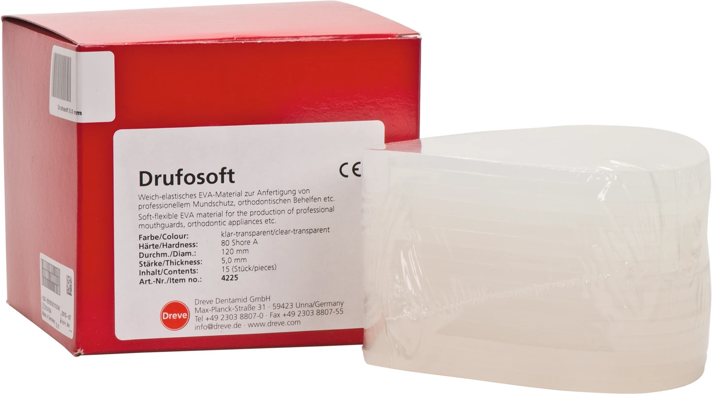 Tiefziehfolie aus Ethylen-Vinylacetat. Weich-elastisch mit hoher Rückstellkraft bei einer Endhärte von 82 Shore A. Laminierbar und bestens geeignet für individuellen Sportmundschutz wie den Dreve Mouthguard, Positioner und Dublierformen.
