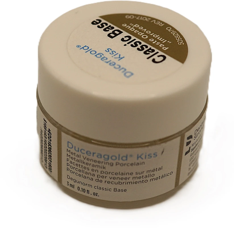 Duceragold®Kiss ist die Verblendkeramik für hochexpansive Legierungen im WAK Bereich von 16,2-17,6 μm/m •K und Bestandteil des bekannten und seit über 15 Jahren bewährten GoldenGate Systems. Duceragold®Kiss ist gleichermaßen für das Verblenden der Presskeramik Cergo Kiss indiziert. Eine Verblendkeramik mit zweifachem Nutzen. Sowohl das Erscheinungsbild als auch die Materialeigenschaften und die glatte Oberfläche mit einem naturkonformen Abrasionsverhalten entsprechen dem natürlichen Zahn.