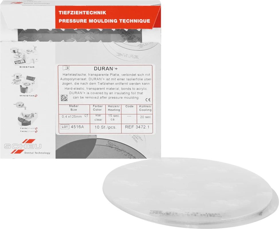 Mit der DURAN®+ wird die Produktgruppe von DURAN® um eine Tiefziehfolie mit aufgebrachter Isolierfolie ergänzt. Der Tiefziehvorgang verringert sich um einen Schritt, da vorab keine separate Isolierfolie mehr tiefgezogen werden muss. Das hartelastische, transparente Material verbindet sich gut mit Autopolymerisaten (z. B. DURASPLINT) und eignet sich für Miniplast-, Aufbiss-, Interims- sowie Fluoridierungsschienen, Röntgenschablonen, Schnarchtherapiegeräte, provisorische Kronen und Brücken.