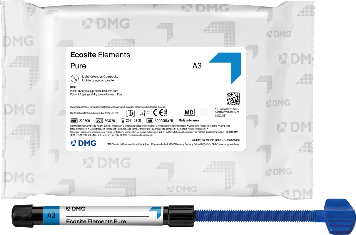 Ecosite Elements ist ein lichthärtendes Nanohybrid Composite-System für den Front- und Seitenzahnbereich, mit dem sich rund 98 % aller typischen Versorgungen meistern lassen – gerade auch ästhetisch anspruchsvolle Fälle. Die intelligente Farbzusammenstellung aus maximal drei Modulen ermöglicht natürlich ästhetische Restaurationen mit jeder Technik. Dank des Push-and-Flow-Effekts lässt sich das Material sicher an den Kavitätenwänden adaptieren, anatomische Details sind exakt gestaltbar. Ecosite Elements überzeugt immer mit einer schnellen und eindrucksvollen Hochglanzpolitur und einem verblüffenden Chamäleoneffekt. Intuitives und schnelles Farbkonzept Außergewöhnliches Handling für maximale Sicherheit und Präzision 98 % aller typischen Versorgungen mit nur einem Material Inhalt 16 x 025 g Safetip