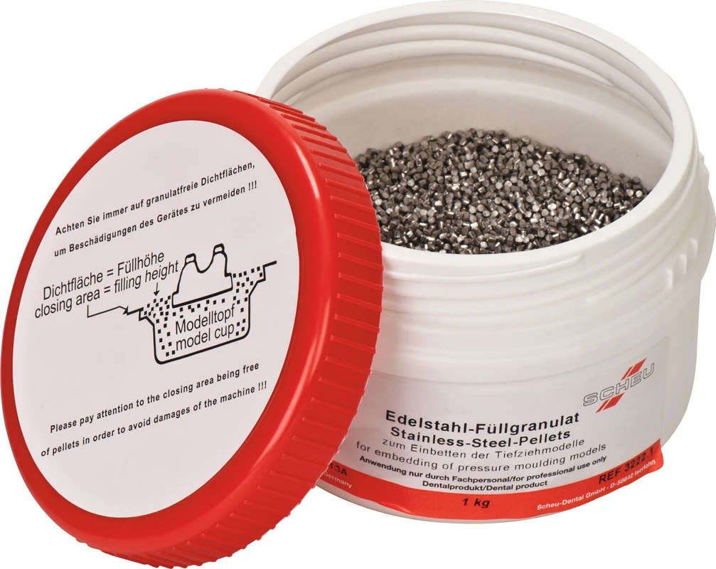 Rostfreies, galvanisch glanzpoliertes Füllgranulat zum Einbetten der Modelle in Tiefziehgeräten. Durch die zylindrische Geometrie der Granulatkörner haben die Modelle einen festen Stand und werden nicht in das Granulat gepresst.