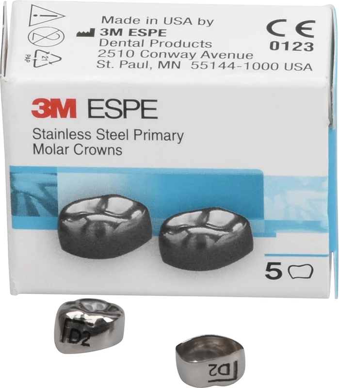 3M™ Edelstahlkronen für 6-Jahr-Molaren bestehen aus einer hochwertigen, gehärteten Edelstahllegierung und bieten dank des zervikalen Federrands eine hochkomfortable Einpassung mit exaktem Randschluss.