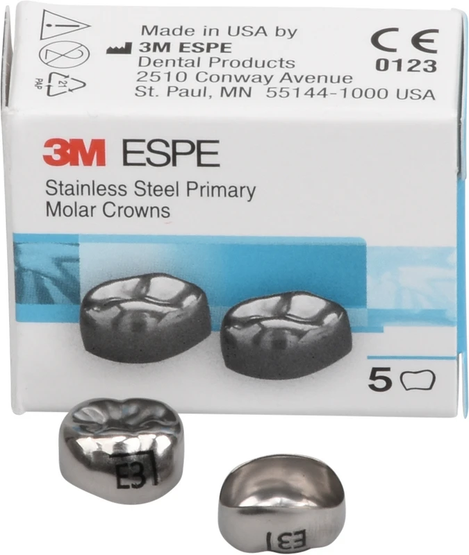 3M™ Edelstahlkronen für 6-Jahr-Molaren bestehen aus einer hochwertigen, gehärteten Edelstahllegierung und bieten dank des zervikalen Federrands eine hochkomfortable Einpassung mit exaktem Randschluss.
