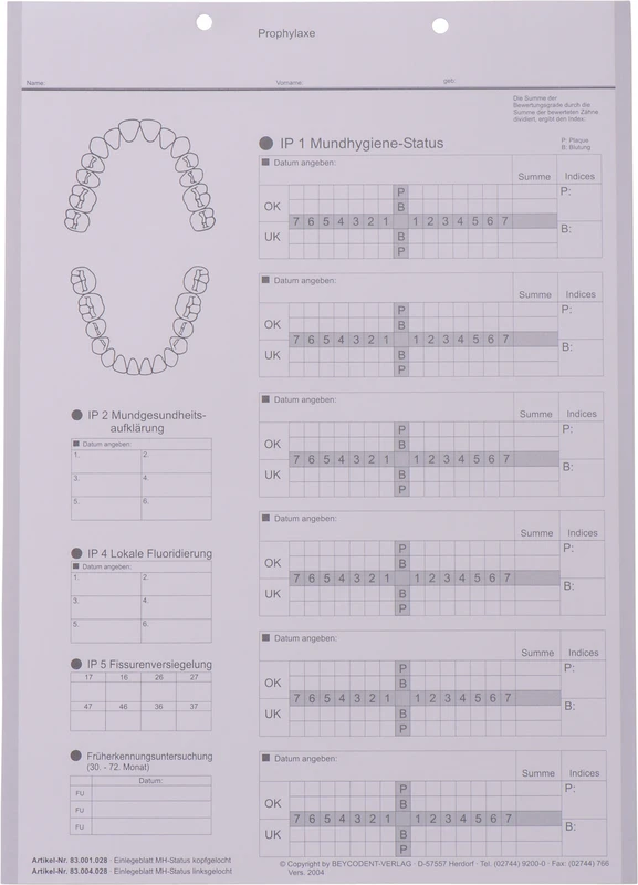 Einlegeblatt Mundhygiene-Status Packung 100 Stück, kopfgelocht