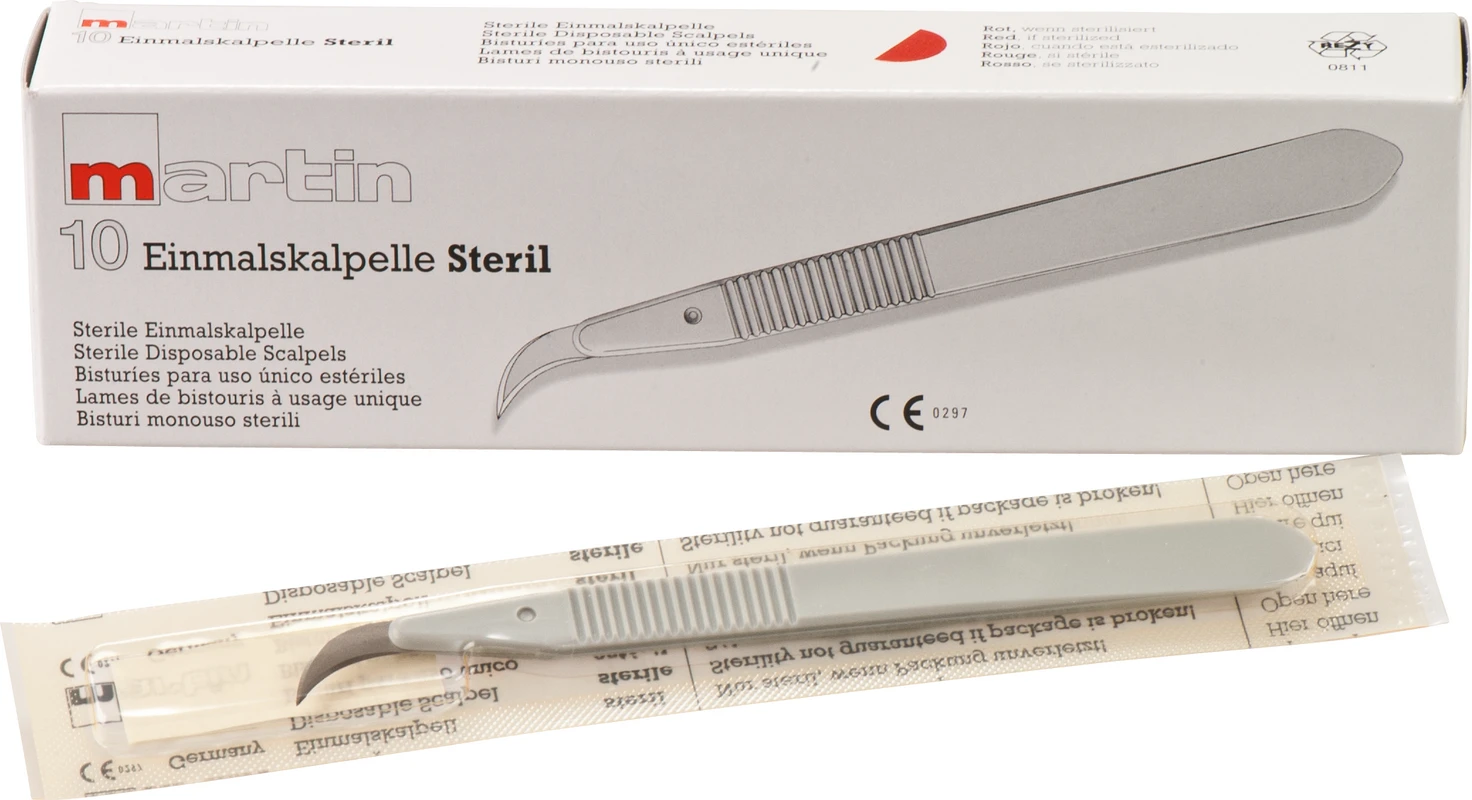 Steril verpackte Einmal-Skalpelle mit Kunststoffgriff, rostbeständig.