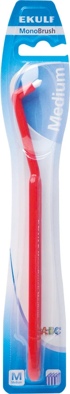 EKULF MonoBrush ist ideal für die Reinigung von Weisheitszähnen, Brackets, Brücken und Implantaten dank des abgewinkelten Halses und des kleinen kompakten Borstenbüschels.