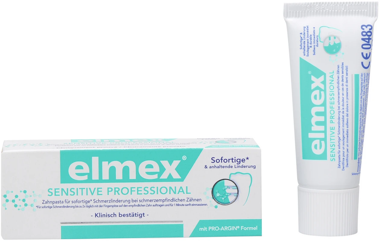 elmex® SENSITIVE PROFESSIONAL™ Zahnpasta enthält die neuartige PRO-ARGIN Technologie, die auch in der zahnärztlichen Praxis eingesetzt wird. Die Wirkstoffkombination aus Arginin und Calciumcarbonat verschließt direkt und tief die Reizleiterkanälchen (Dentintubuli), wodurch eine Schmerzlinderung eintritt.